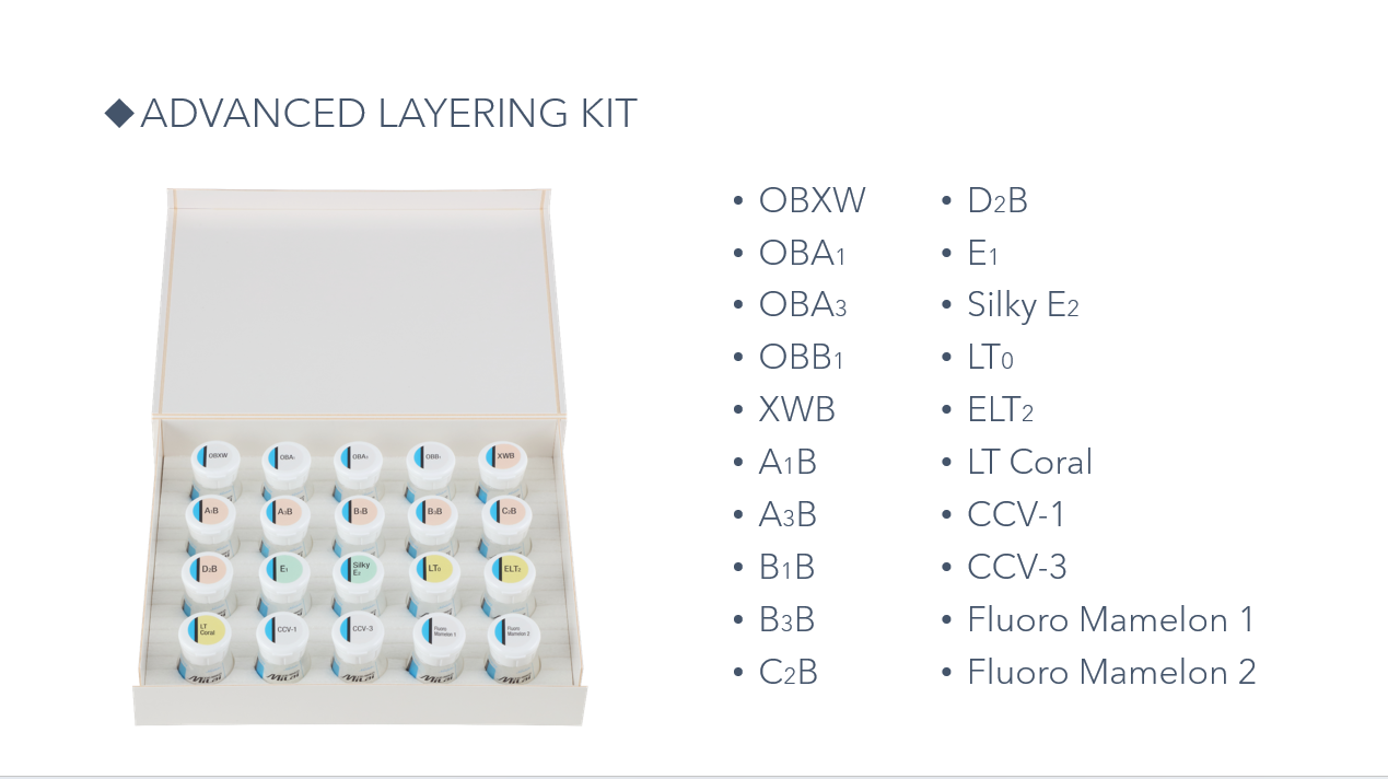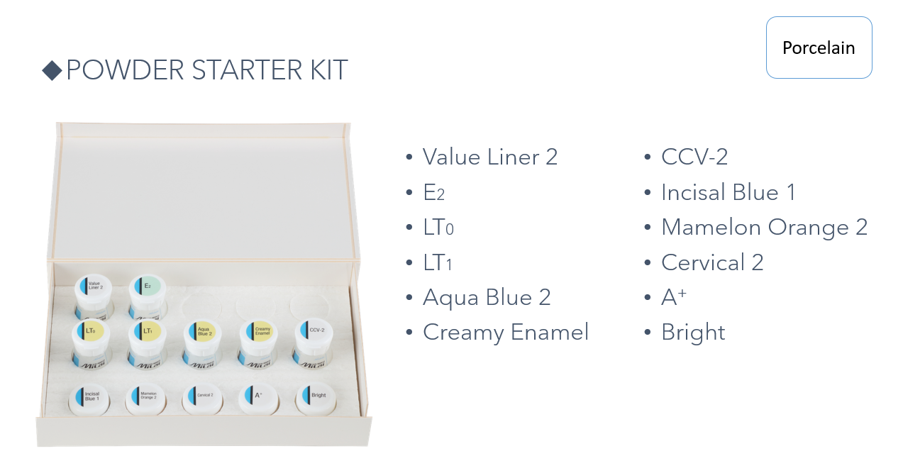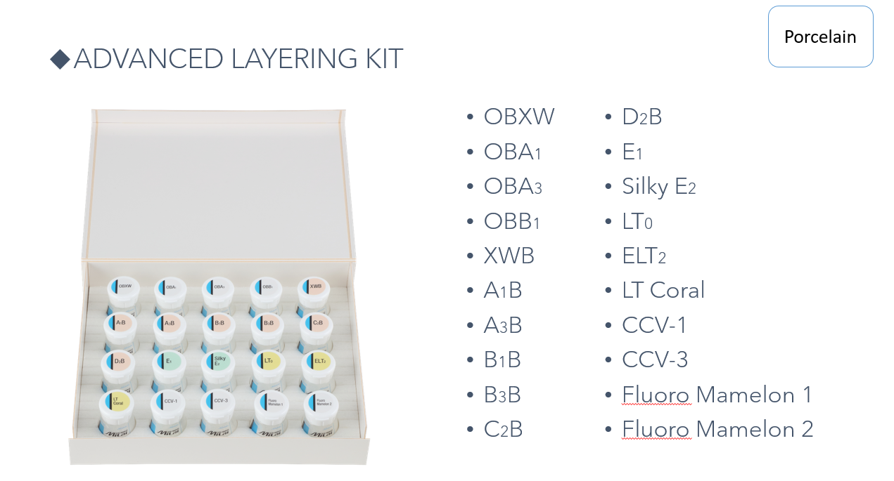 CERABIEN™ MiLai porcelain is built on a legacy of innovation that began in 1987. Developed using decades of proven technology and expertise, this advanced system combines time-tested reliability with modern enhancements to meet today’s aesthetic demands. Designed for the micro-layering technique, CERABIEN™ MiLai delivers exceptional color depth, translucency, and natural beauty—even in ultra-thin layers. Compatible with both zirconia and lithium disilicate, it offers unmatched versatility and performance, empowering dental professionals to create restorations that are as durable as they are lifelike.”