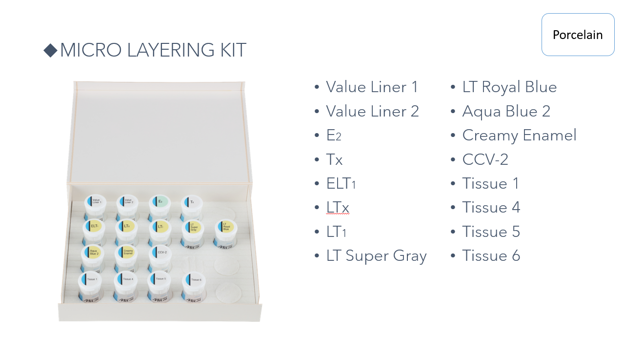 CERABIEN™ MiLai porcelain is built on a legacy of innovation that began in 1987. Developed using decades of proven technology and expertise, this advanced system combines time-tested reliability with modern enhancements to meet today’s aesthetic demands. Designed for the micro-layering technique, CERABIEN™ MiLai delivers exceptional color depth, translucency, and natural beauty—even in ultra-thin layers. Compatible with both zirconia and lithium disilicate, it offers unmatched versatility and performance, empowering dental professionals to create restorations that are as durable as they are lifelike.”
